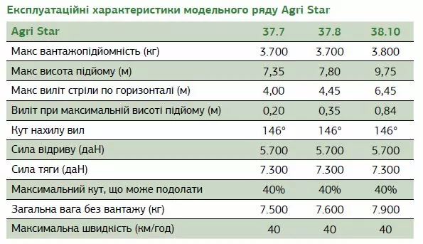 Головними відмінними особливостями моделей телескопічних навантажувачів Agri Star є: висота підйому стріли, потужність і вантажопідйомність. Вони здатні піднімати вантажі масою до 3800 кг. Максимально можлива висота підйому становить 9,75 м. Машини, в яких вказані параметри вищі, підходять для масштабних робіт, а компактні варіації оптимальні для обмежених просторів. Ви можете вибрати будь-яку модифікацію телескопічного навантажувача в залежності від цілей і потреб.